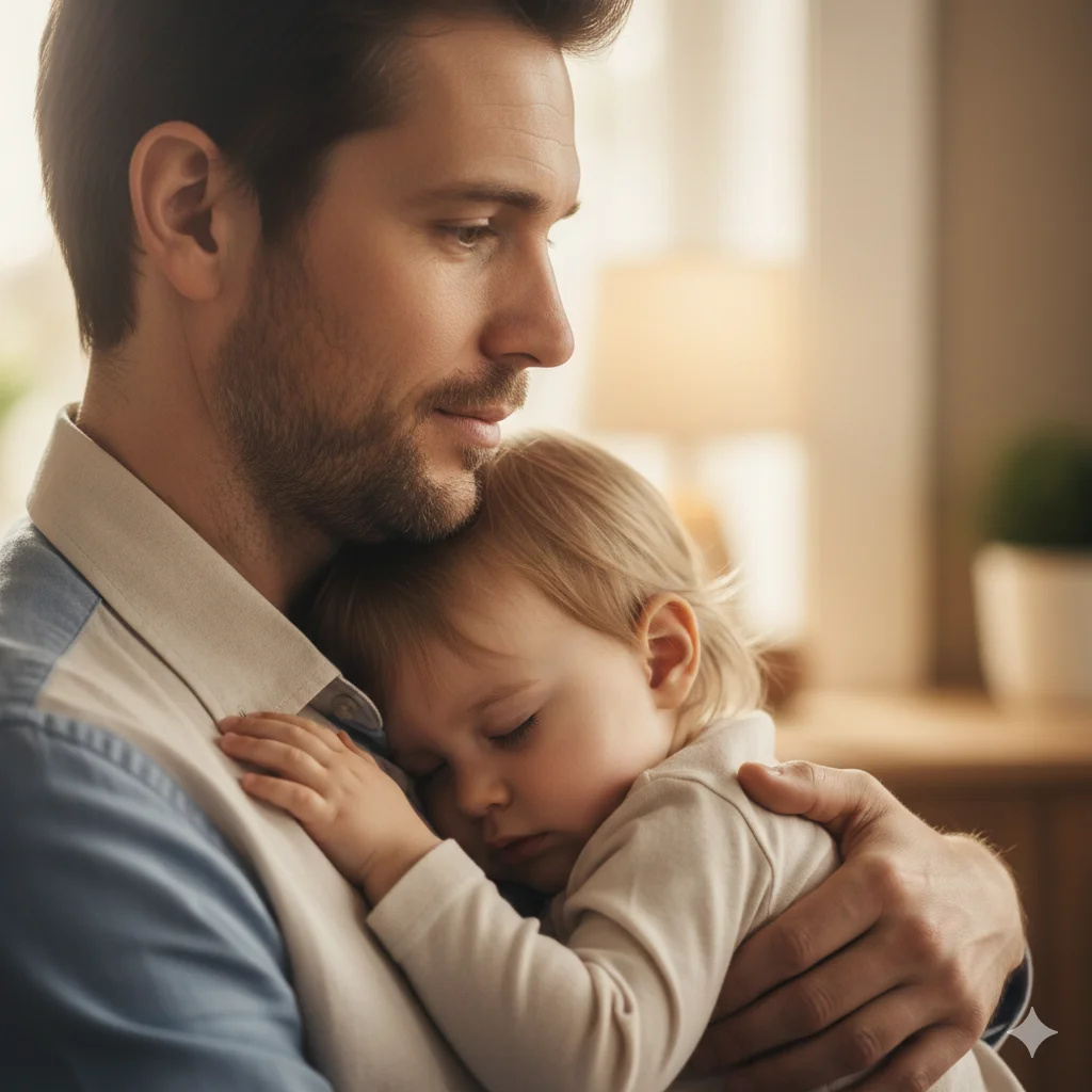 “Create an emotional photo of a father comforting his child with a gentle hug. Soft lighting, close framing, natural expressions, and a calm, reassuring emotional tone.”
